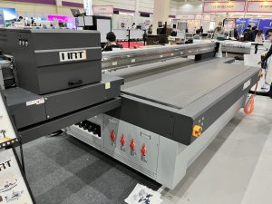 FLORAのフラットベットUVプリンター《XTRA3220/2512LED》スピード重視の見せ方。ドラフトモードで190㎡/h。プロダクションモードでも113㎡/h。肝心の画質もプロダクションモードでは通常使用で使えるモードの美しさ。韓国国内での販売を手掛ける代理店での出展でした。