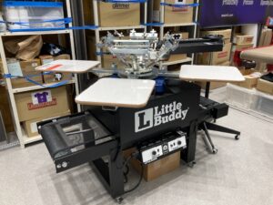 4枚の版をセットできる回転式の印刷台と、コンパクトタイプのベルトコンベア式乾燥炉が一体化したモデルです。下部に備え付けられた乾燥炉により、印刷後すぐに本格的な乾燥工程に移れるのが大きな特徴。限られたスペースでも導入可能な設計で、店舗など小規模な現場にも適しています。