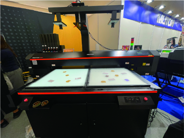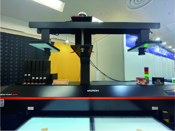 武藤工業株式会社が販売するフラットベットUVプリンター「XpertJet 1462UF」に、オブジェクト位置を自動認識するカメラを取り付けて展示。位置がばらついていても印刷可能で、治具不要のUV印刷の可能性を感じさせるものでした。