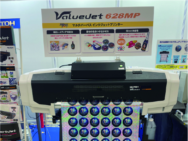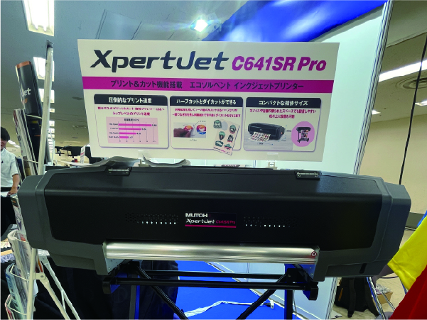 本体サイズ幅1,190mm・高さ366mmながらプリント&カット機能を搭載し作業環境のコンパクト化を実現する溶剤プリンター「XpertJet C641SR Pro」や、シュリンクフィルムやホログラムシートなど幅広いメディアに対応するMPインク搭載の「VJ-628MP」を展示していました。