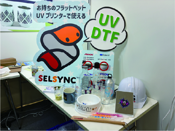 さらに、ランチボックスなどの食品パッケージに適した水性インクを搭載し、吸水性のある紙に印刷可能なDGI社の「PRESTO」や、フラットベットUVプリンターで出力したデザインを転写できるフィルム「SELSYNC」のサンプルやパンフレットもご用意。特に「SELSYNC」は大変好評をいただきました。