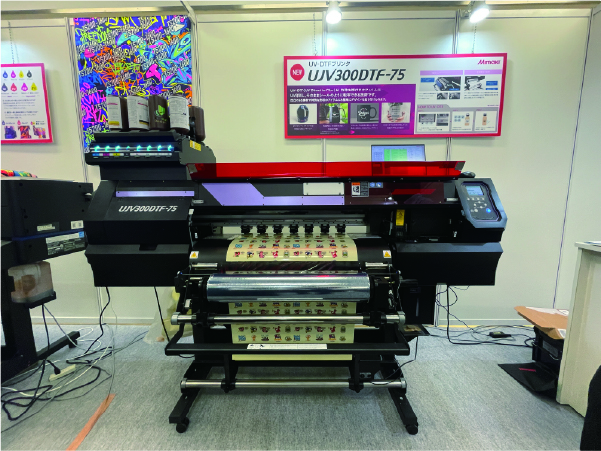 また、既に販売されているUV-DTF型プリンタ「UJV300DTF-75」も実機展示されていました。こちらの製品は弊社の公式HPに掲載しております「新着情報」でも取り上げておりますのでぜひ下記リンクよりご覧ください。