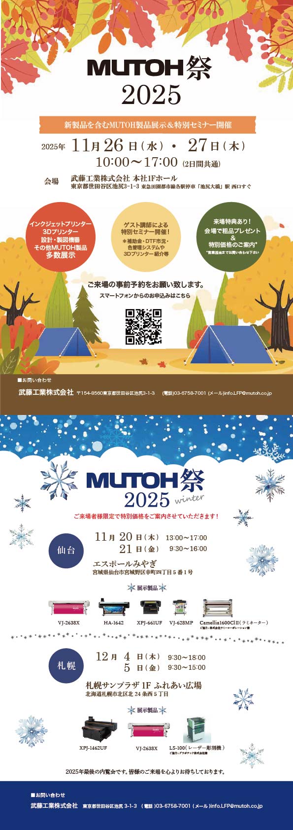 最新機種やMUTOHだけしかやっていないジャンルなどのプリンターを展示し、その魅力を直接ご覧いただき体感していただけるイベントとなっております。