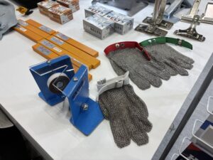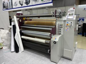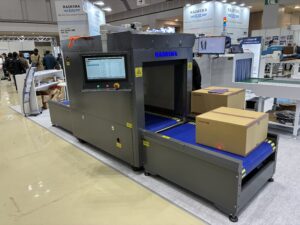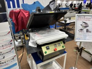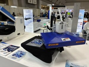 アパレル製品の品質管理を支える機器: 転写機以外にも、布製品には欠かせない検針機やX線検査機などの品質管理機器も取り扱っており、日本のアパレル業界を長年支えてきた同社の存在感を示すブースでした。