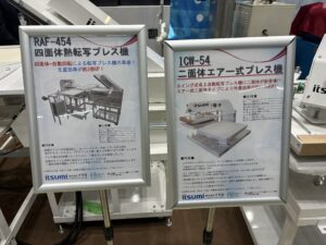 ユニークなモデルの展示: 二面体のスイング式卓上自動転写プレス機【ICW-54】や、四面体自動回転熱転写プレス機【RAF-454】など、作業効率向上に貢献するモデルがラインナップされていました。