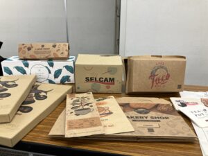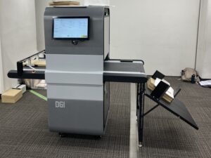 パッケージ印刷向けの1Passベルトコンベア式ダイレクト水性顔料プリンター【PRESTO】の実機展示。ランチボックスやコースターや封筒などのオンデマンド印刷に適したプリンターです。