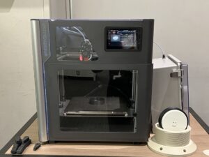 糸状(直径1.75mm)の樹脂を溶かしながら積層造形する、国内メーカーの3Dプリンター【G-ZERO】を展示しました。最大造形サイズは約250×200×200mmで、ロボットの関節アームに使用される小型歯車など、実用部品の製作事例を紹介。弊社のINKCUPSに使用する固定具を作成して頂きましたが、わずか30分ほどで完成していました。