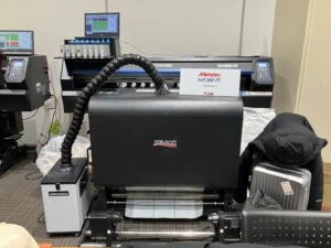 従来機【TxF150-75】から生産性を大幅に向上させた、ダブルヘッド仕様のロールtoロールDTFプリンター【TxF300-75】を展示しました。ホワイトインクを4チャンネル搭載し、大判Tシャツの生産能力は22枚/時から62枚/時へと向上。短時間での大量生産に対応します。なお、シェイカーは弊社が取り扱う【D800】を使用いただきました。さらに、シールのように素材へ貼り付けられるUV-DTFプリンター【UJV300DTF-75】やフラットベッド型UVプリンター【UJF-7151 PlusⅡe】は”厚く盛る””深く打つ”機能や生産性・ランニングコスト削減を追求したハイパフォーマンスモデルです。