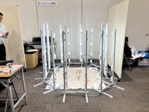人間型の3Dスキャナー【マジカルスキャナー】から、今年初のお披露目となる64台のカメラを搭載したペット・小物向けの3Dスキャナーを展示。従来とは異なり、分離型の衝立構造のため、省スペースでの設置・収納が可能です。ミニチュアや記念品の需要が高まる中、ノベルティグッズを製作するお客様を中心に注目を集めていました。