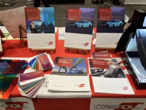 カーラッピング用途で定番の96色展開【ORACAL 970シリーズ】を展示。優れた寸法安定性と高い光沢性を備えています。また、キャスト製法による屋外対応のラメ入りメタリックシート【ORACAL 851シリーズ】やプリントプロテクションフィルム【ORAGUARD 2815+】を展示し、特に【ORAGUARD 2815+】ではデモンストレーションを行い、耐久性や保護性能を分かりやすく紹介していました。