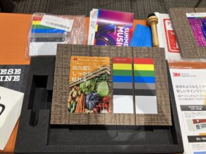 塩ビメディアから壁紙まで、幅広い用途に対応した多彩なメディアを展開。中でもメディアやラミネートが5年以内にはがれた場合に素材保証がついた【グラフィカルシリーズ】が魅力です。他にも検品作業を効率化できる治具付き商品【ろく郎】も展示され、軽量で扱いやすい点が注目されていました。