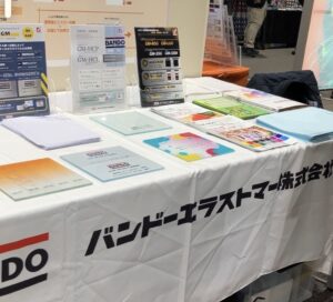 インクジェット対応の壁紙【ベガ】シリーズや、糊を使わず滑り止めで貼れる【どこでもOKシート】をはじめ、床用の床フィルム エンボス糊付抗菌】などを紹介。他にもアスファルト施工が可能な【ピタッとシート】や、耐水性のある自己吸着型のターポリン【SB吸着ターポリン】など、ユニークな名称と高い施工性が特長のメディアを展示しました。