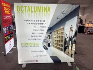 押出成形による多様なアルミ部材を取り扱い、今回は内照式ファブリックサイン【オクタルミナ】を中心に展示。ファブリックサインは商業施設や店舗装飾など常設空間にも広がっており、今後の市場拡大が期待されています。