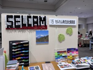 おなじみの10cm角メディアサンプルをはじめ、イベント会場や展示会ブースを華やかに演出できる【スパンコールパネル】、本来廃棄されるはずだったペットボトルをリサイクルして製造した、インテリアになじみつつ自由に形状を変えられるおしゃれな【吸音パネル】など、一風変わったメディアを展示していました。