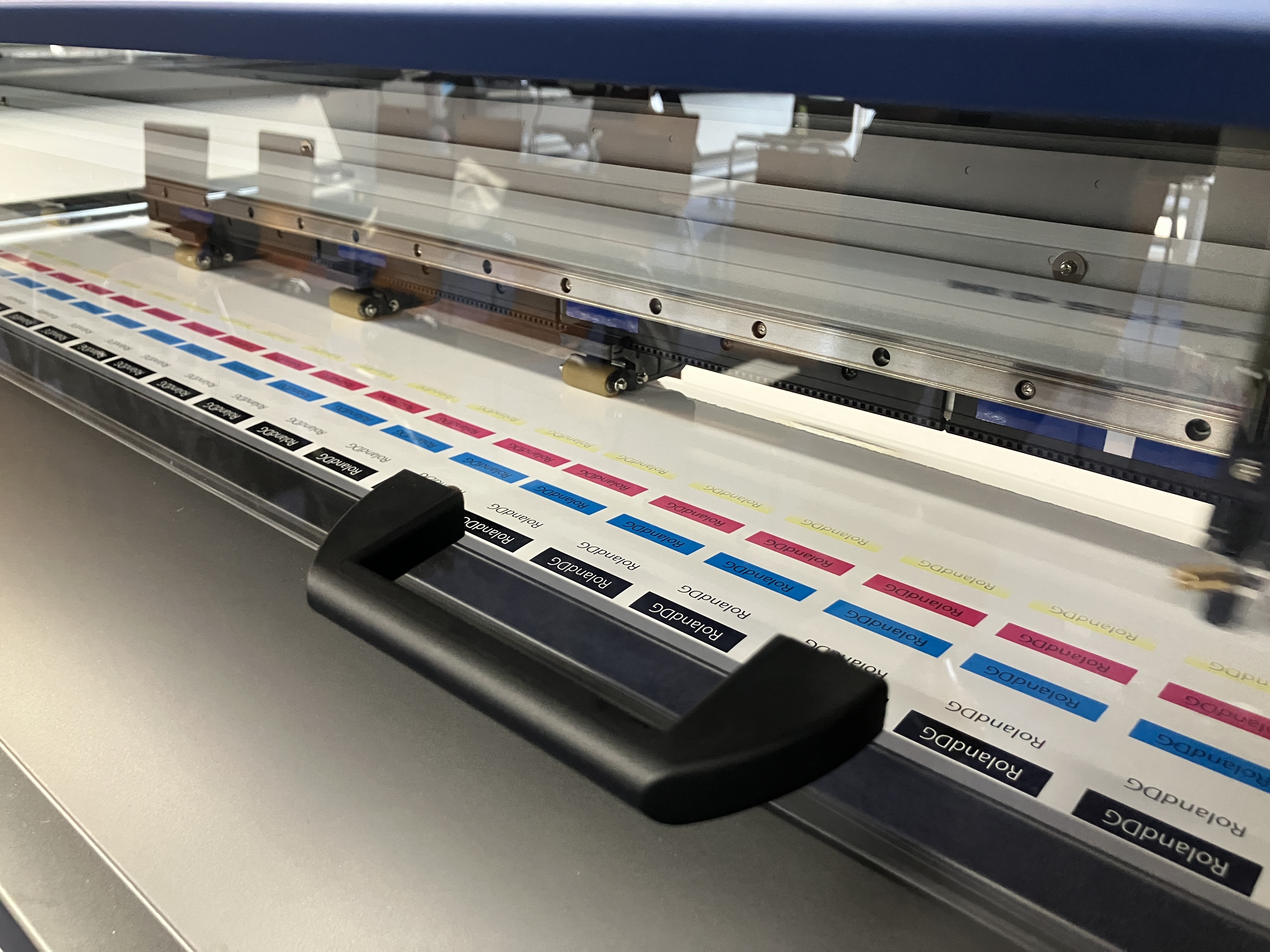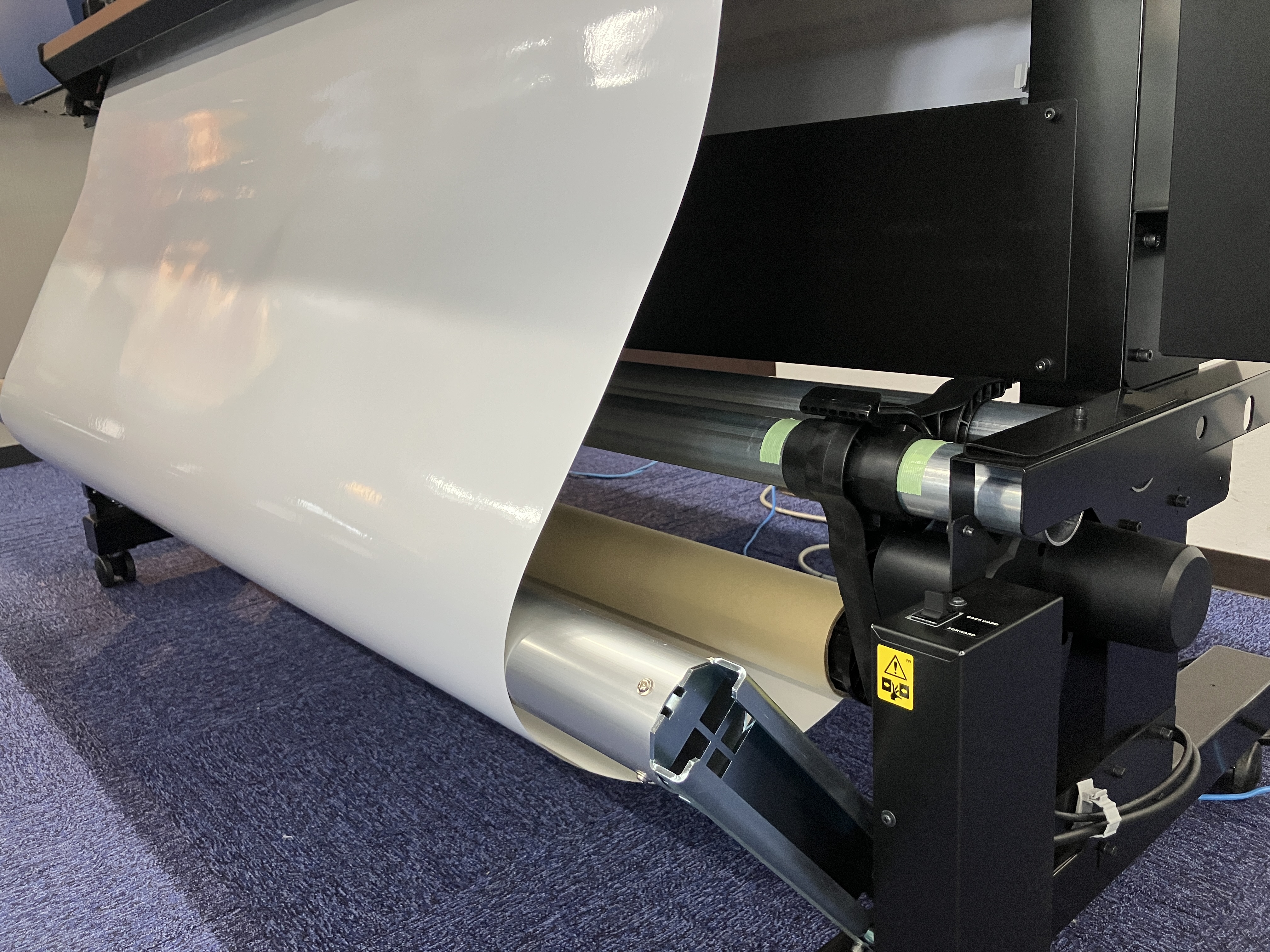 これまでは難しかった「印刷→戻ってハーフカット→巻き取り」の工程がスムーズに。 印刷が終わると、メディアを自動で元の位置まで戻してハーフカットを開始。そのままカットしながら巻き取ってくれるんです!