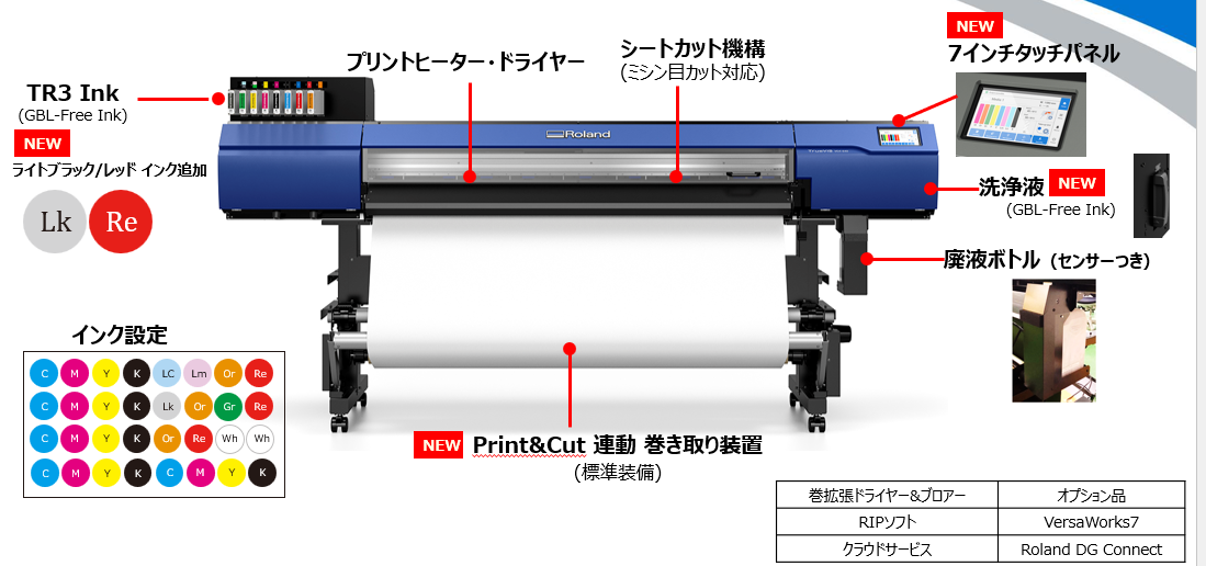 前機種(VG3)と比較すると、本体価格は据え置きとなっており、大きな価格上昇がない点は導入検討のハードルを下げる要素といえます。加えて、レッドインクの追加による色域の拡張を踏まえると、表現力の面では確実に進化している印象です。