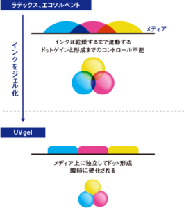 インクをジェル化してドットゲインをコントロールすることにより、インク同士の不用意な混合やにじみの発生を抑止して、色の正確性、一貫性、シャープさを保ち高画質を生みだします。