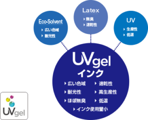UVgelインクはエコソルベントの広い色域、ラテックスの無臭等の環境性能、UVの高生産性といった長所を併せ持つインクです。さらに今回白インクに対応したことにより、表現の幅がさらに広がりました。